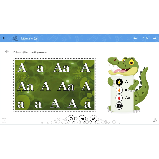 - zestaw multimedialnych ćwiczeń do nauki i różnicowania 44 drukowanych i pisanych (małych i wielkich) liter polskiego alfabetu (uwzględniający wieloznaki),