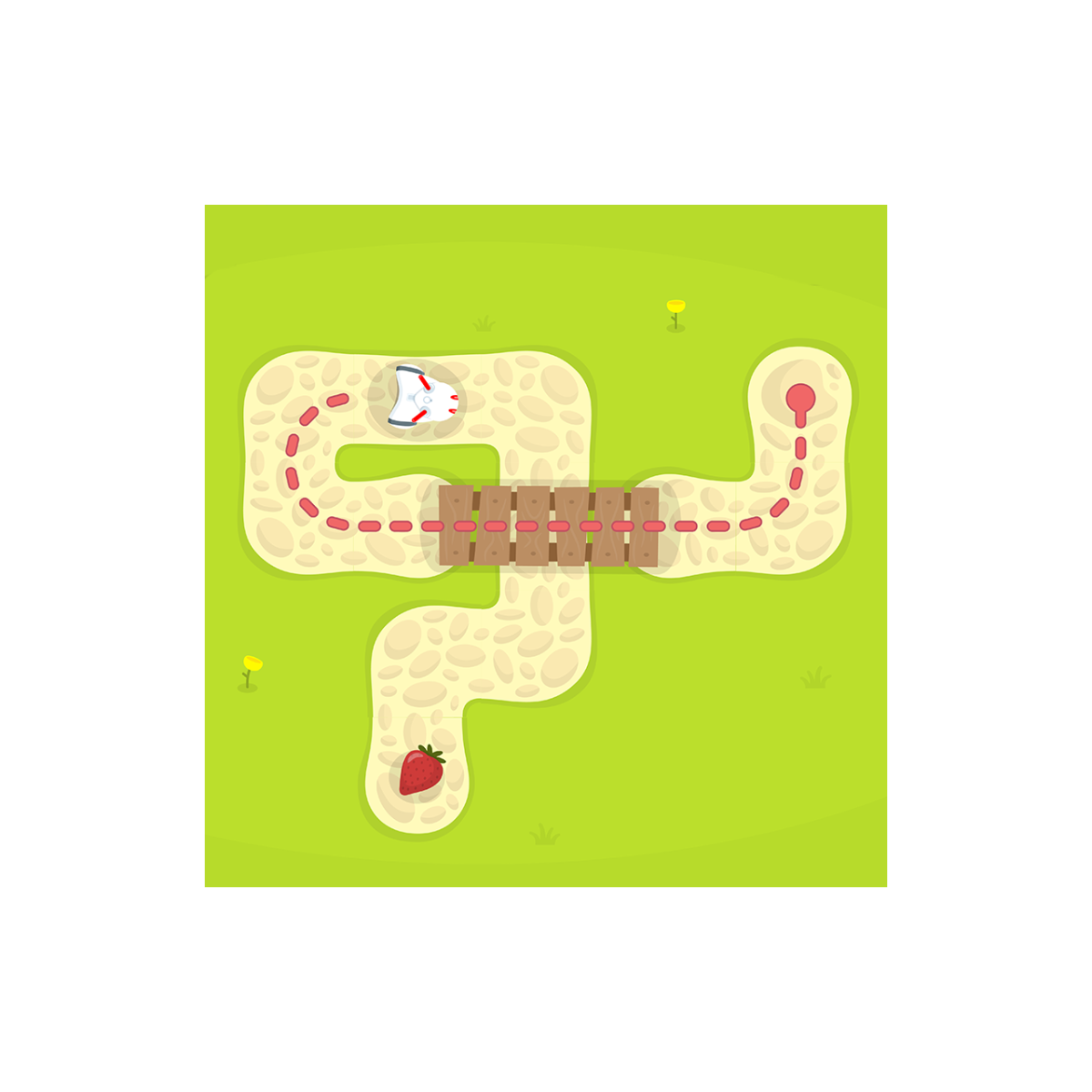 Pomóż robotowi pozbierać owoce z koszyka, zanim rozpoczną piknik. Dzieci uczą się sekwencjonowania działań i planowania ruchu. -